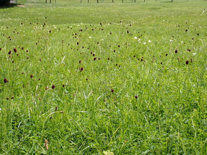 Hohe Staudendichte des Großen Wiesenknopfes nach günstiger Mahd.
