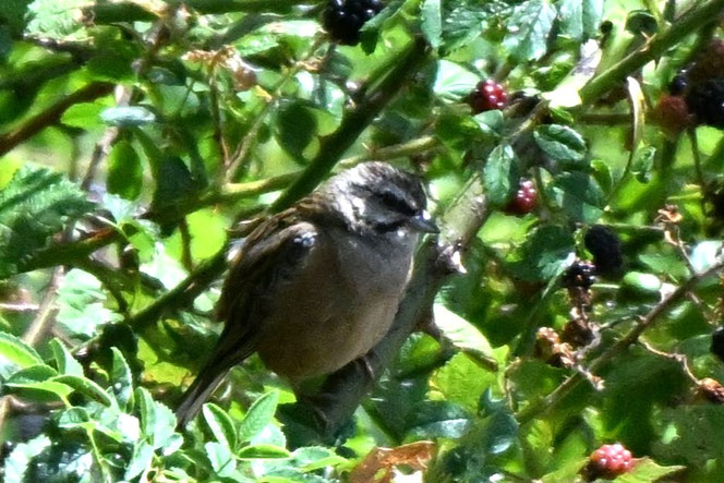 Dieser Zaunammer-Ästling hat sich eine gute Deckung in einer Brombeerhecke am Rande unserer Flächen gesucht, noch sind seine Flugkünste überschaubar. Seine Geschwister riefen verteilt in dichtem Buschwerk sitzend, die beiden Elternvögel fütterten eifrig.